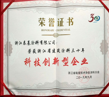 浙江泰基涂料有限公司獲得“浙江省建筑涂料三十年優(yōu)秀企業(yè)”榮譽稱號。總經理周航帆獲得“浙江省建筑涂料三十年優(yōu)秀企業(yè)實力新人獎”。